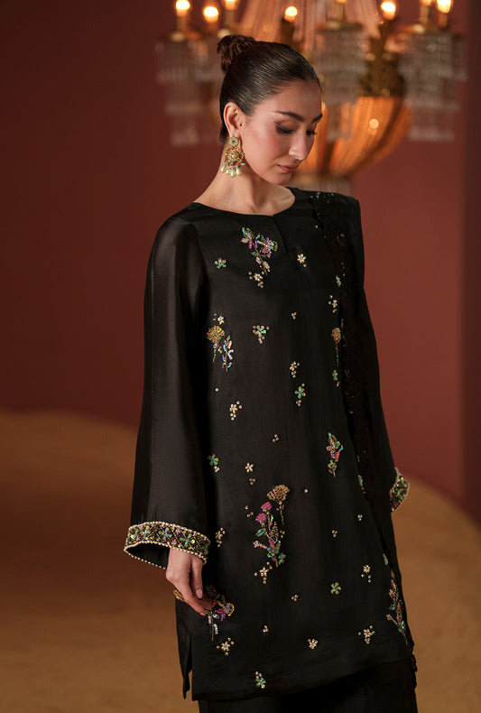Black Embroidery Charmeuse Long Shirt - Haseens | Darbar Formals | Shabrang