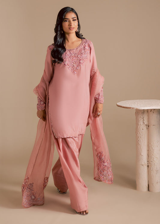 Salmon Pink Color Embroidered Grip Short Shirt - Maria Osama Khan | Noir Bliss Luxury Formals | Blush Dew