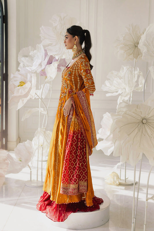 Burnt Orange Embroidered Sheesha Silk Open Gown With Sharara - Mina Hassan | Festive Dholki 25 | Afra