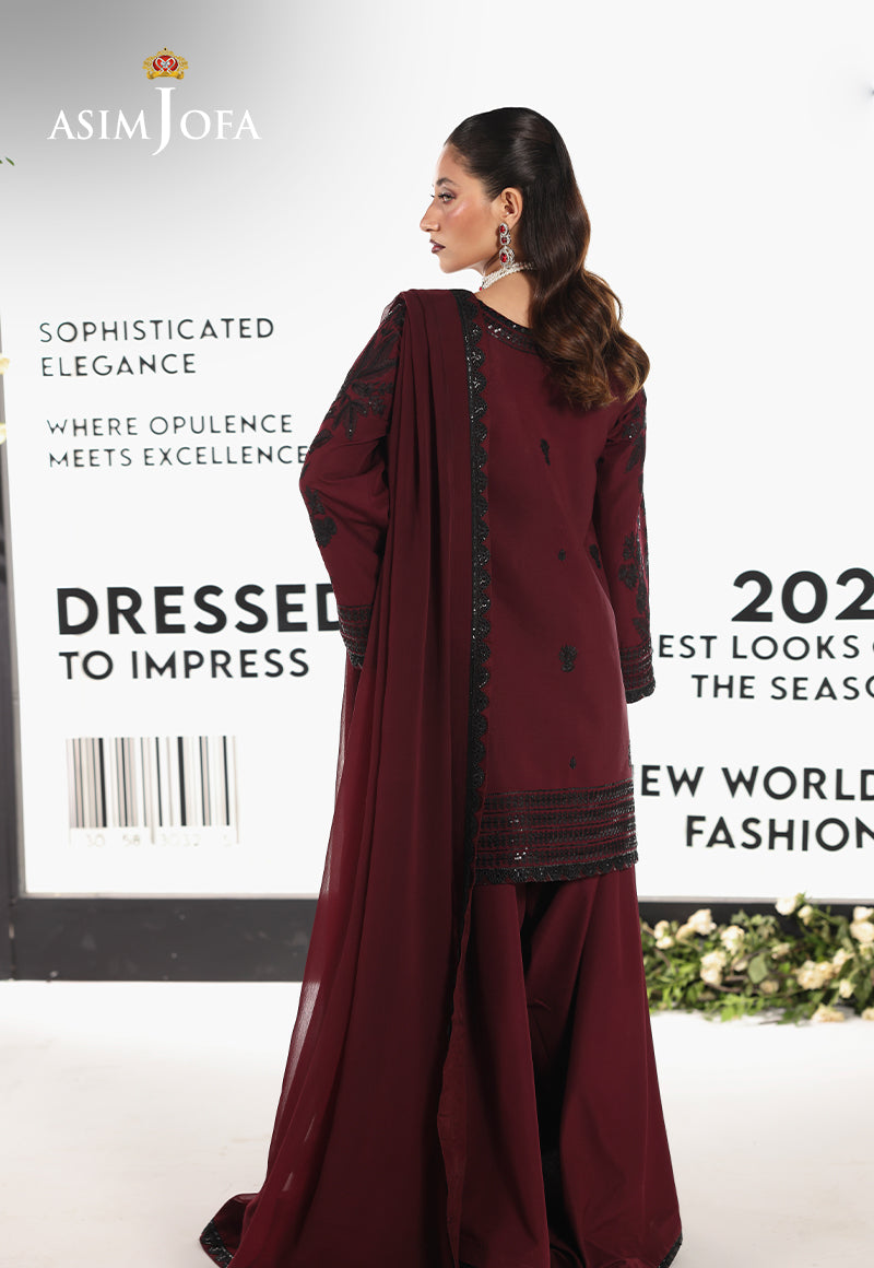 Effortlessly poised, this maroon ensemble channels understated allure with a contemporary twist. The shirt features sleek black threadwork accentuated by tonal black sequins, adding a soft shimmer and rich texture against the deep maroon base a harmony of contrast and restraint. Paired with a flowy chiffon dupatta and matching trousers, the look is minimal yet magnetic, designed for moments where simplicity speaks volumes.