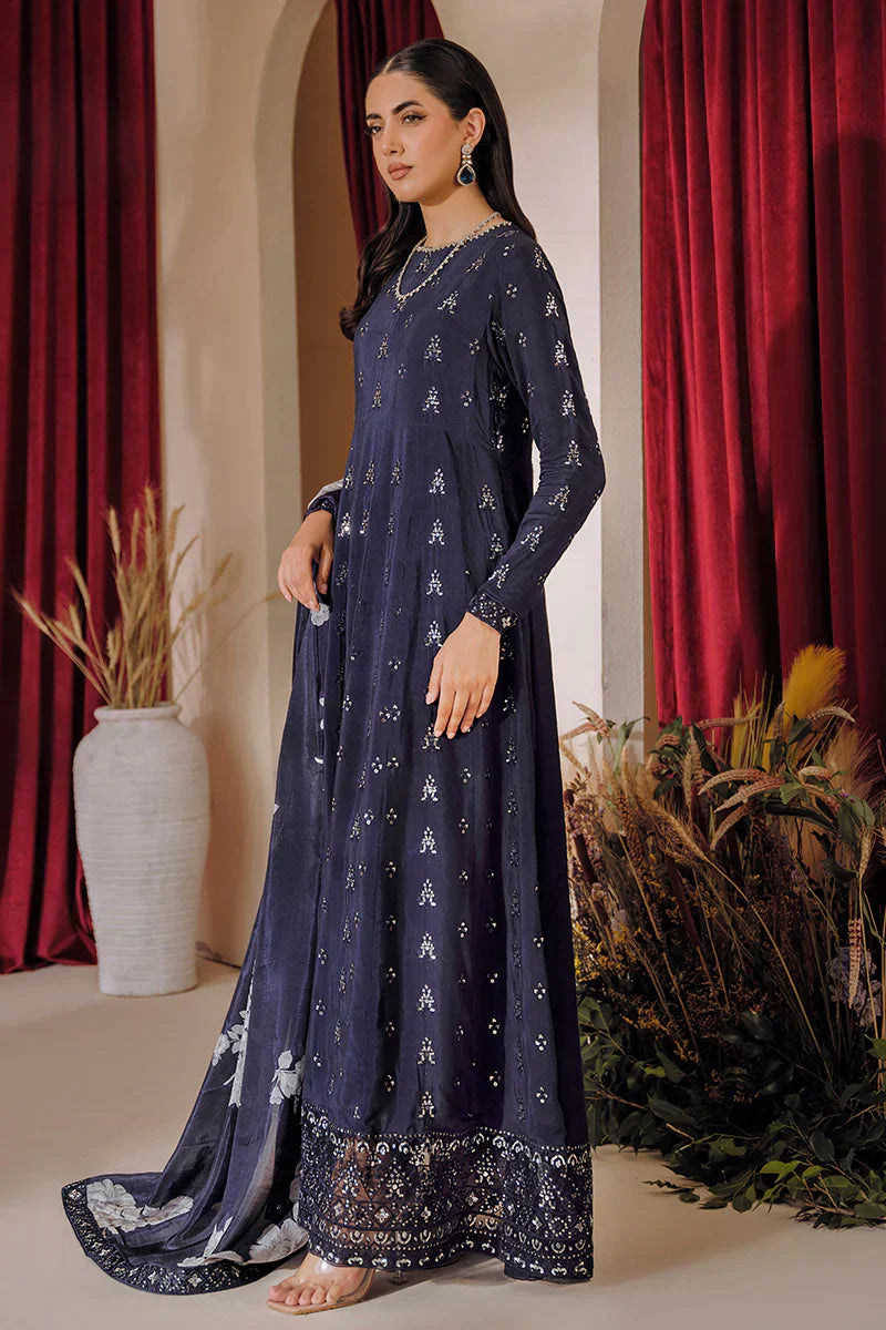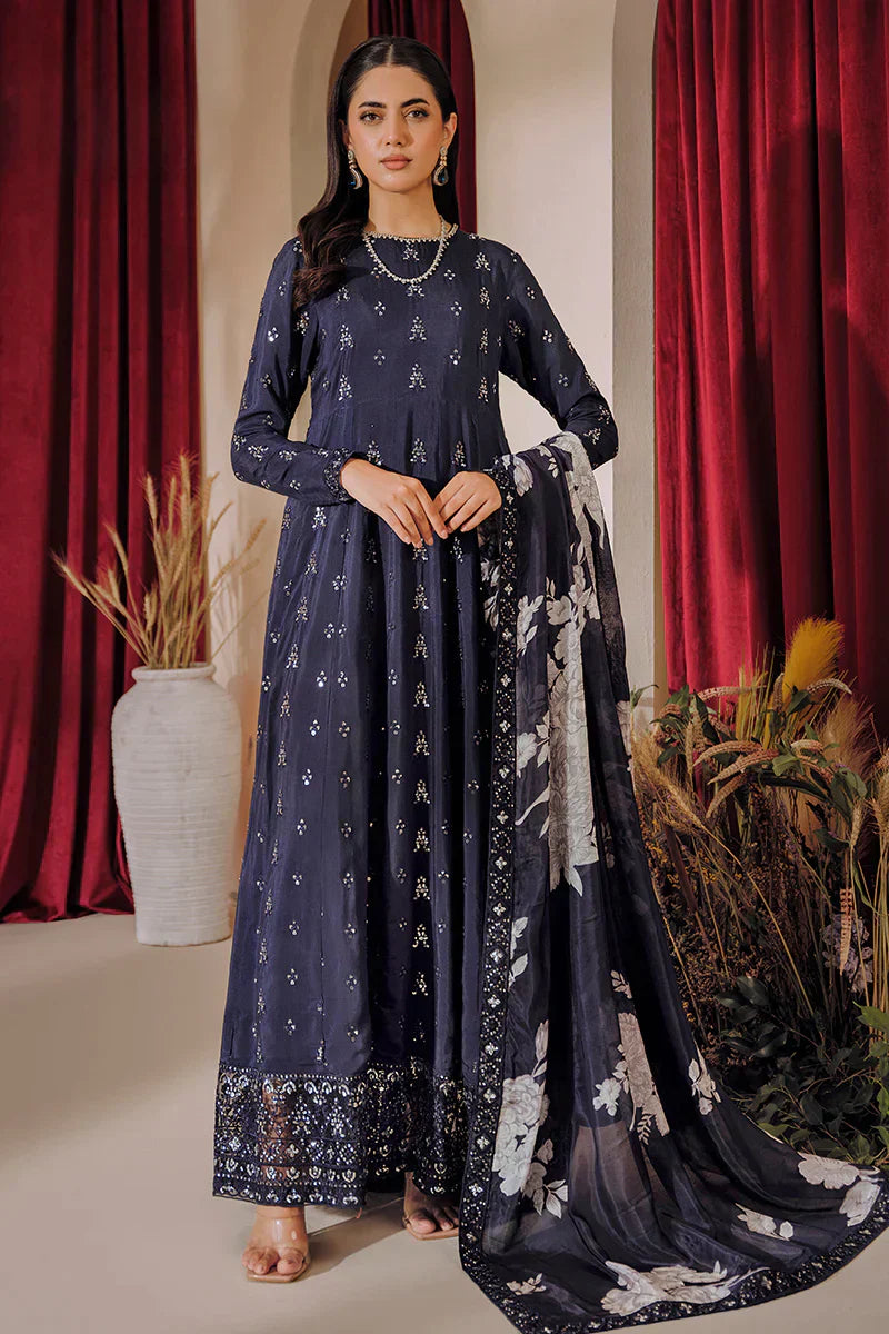 MOON LIGHT is a stylish classic pishwas perfect for any occasion. Featuring a round neckline with hand embellishment and raw silk fabric, the dress has a front sequin embroidered design and plain dyed back. The sleeves have a silk digital printed floral design with an embroidered border and the dupatta adds a beautiful finishing touch.
