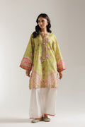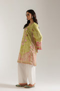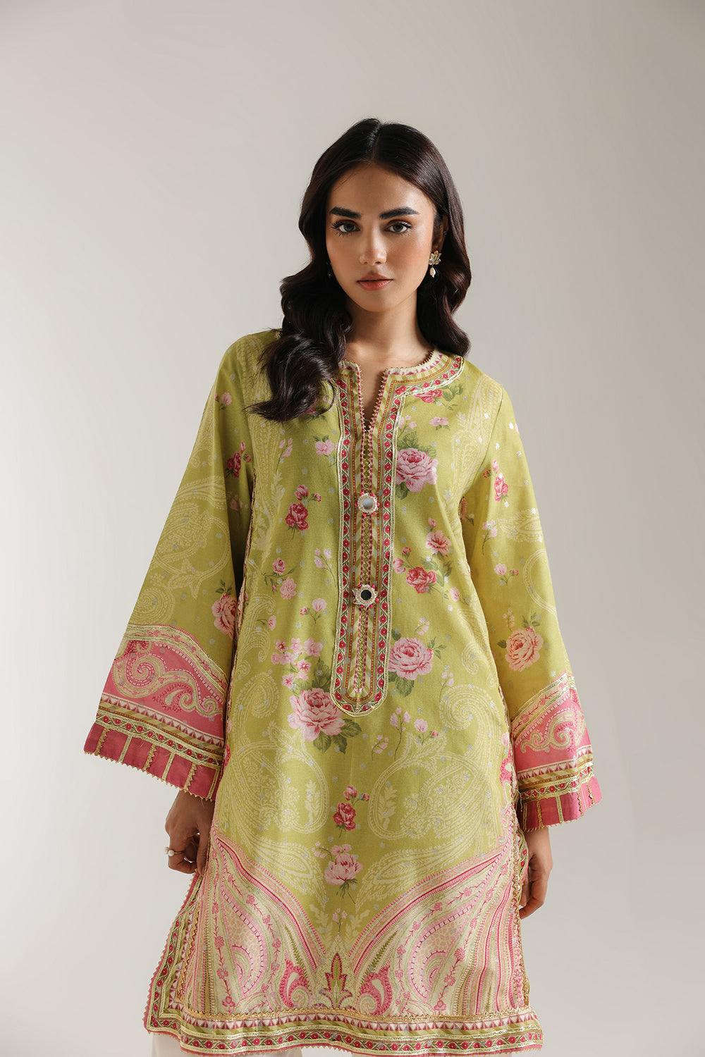 Drape yourself in luxurious elegance with this stunning printed jacquard shirt, intricately woven with shimmering zari. The rich, vibrant print, in shades of pink and green bloom against a delicate lime base, creating a truly captivating visual. The exquisite zari work woven into the fabric adds a subtle yet opulent sheen, elevating the design. The shirt features a beautifully detailed neckline with ornate accents and gracefully flared sleeves adorned with complementary patterns and borders. Paired with classic white shalwar, this ensemble offers a sophisticated and comfortable silhouette, perfect for festive occasions and formal gatherings. Embrace the artistry and richness of this exceptional piece.