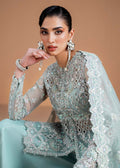 Turn heads in this enchanting ice blue ensemble. The short, front-open shirt is adorned with intricate all-over embroidery and delicate hand embellishments, exuding subtle elegance. A chic keyhole detail at the back adds a graceful hint of allure. Paired with contemporary flared pants and a fully embellished dupatta that brings just the right touch of sparkle, this look is perfect for making a memorable, show-stopping entrance.