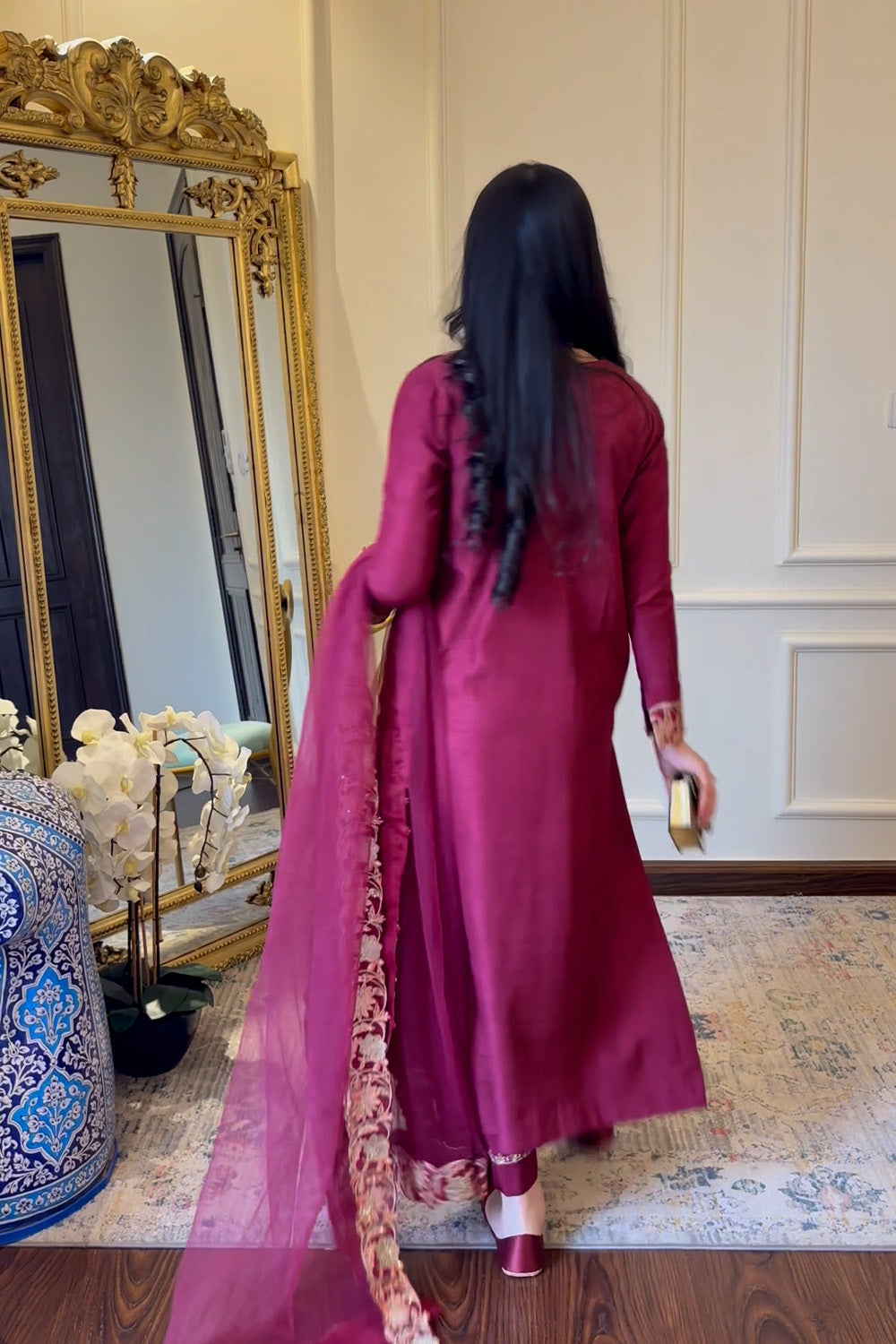 Radiate charm in this captivating Dark Ruby 3-piece pret ensemble, tailored in premium Korean Silk. The straight shirt features a graceful round V-neck with a front slit, adorned with intricate embroidery for a rich finish. A screen-printed border at the hem adds a contemporary flair, perfectly complemented by embroidered detailing on the trousers. The straight silhouette offers a refined and flattering fit. Paired with a net dupatta edged with four-sided embroidered borders, this outfit strikes the perfect balance between classic grace and modern design.
