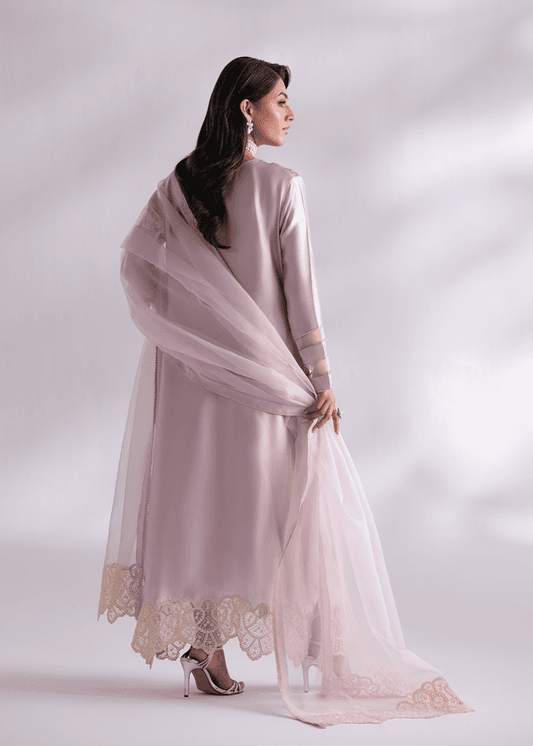The "Stella" outfit is the perfect embodiment of feminine elegance, crafted from soft chiffon for a breezy and light feel. The outfit features delicate lavender tones, adding a serene and refreshing touch. The embroidered yoke and sleeves beautifully complement the graceful silhouette, enhancing its timeless charm. Paired with an ethereal organza dupatta, this ensemble flows effortlessly, making it perfect for any elegant occasion. The combination of the soft, airy fabrics and subtle details creates an effortlessly chic look, ideal for those seeking sophistication with a touch of femininity.