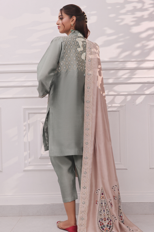 Zeba is a sophisticated and elegant ivory sheesha silk suit with intricate black embroidery. The maroon aari bail on the neckline adds a touch of luxury while the self embroidery on the front creates a beautiful texture. The black border on the daman is complimented by the maroon embroidery and cutwork. The ivory pure organza dupatta is adorned with hand work and finished with 2 color patties in the center.