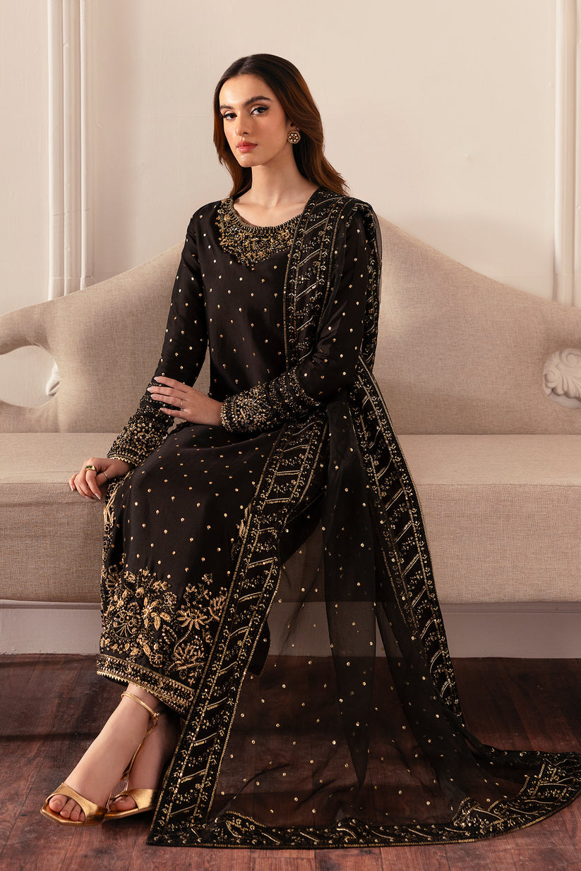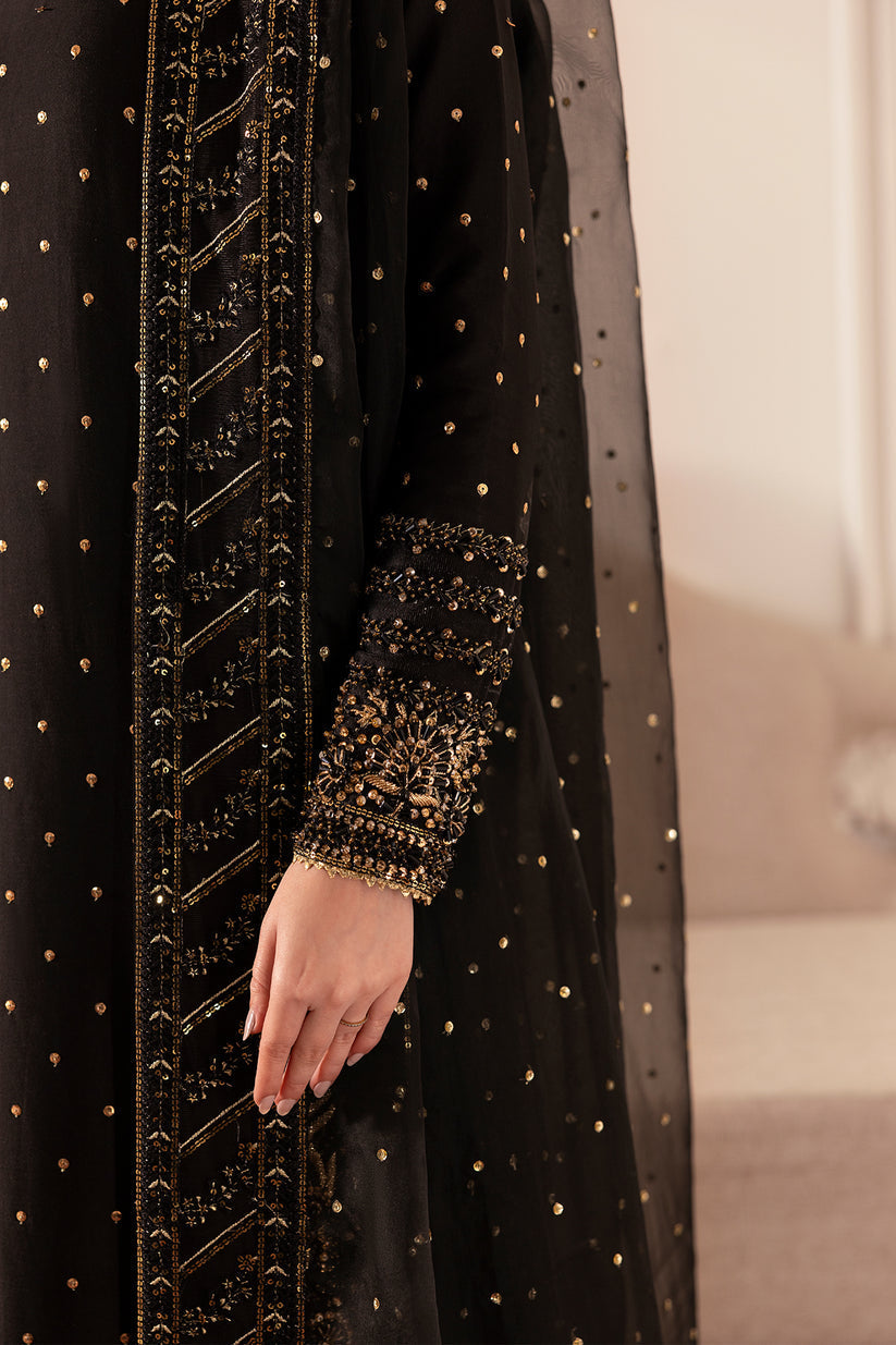 Make striking statement of timeless allure in this breathtaking black silk ensemble. The straight cut shirt is heavily ornamented with gold embellishments, gracefully interwind with black crystals and stones creating a mesmerising play of depth and brilliance. Paired effortlessly with wide-leg silk pants and embroidered sheer organza dupatta, This look is the epitome of refined elegance. The sequin spray all over the dupatta further adds an ethereal touch, ensuring a look that is enchanting.