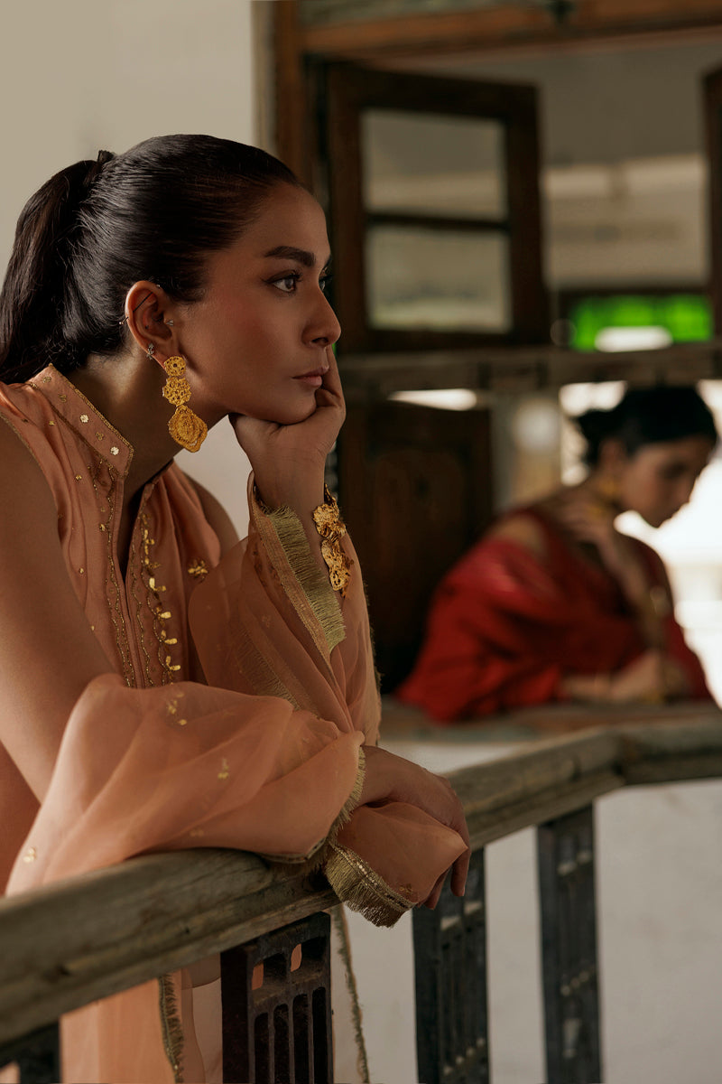 Delicate and dreamy, this light pink ensemble features a sleeveless short shirt with a beautifully detailed kamdani neckline that catches the light with every movement. It's paired with a block-printed dhaka pajama, adding a touch of artisanal charm, and an airy organza dupatta sprinkled with chann and finished with silk pallus-balancing structure and softness. This ensemble exudes quiet luxury and timeless femininity.