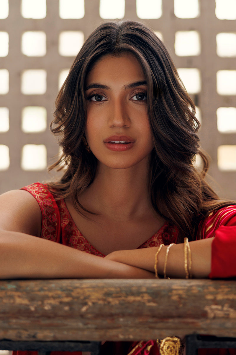 Elegant 3-piece pure silk ensemble featuring a long, sleeveless straight-cut shirt in a rich red base, adorned with intricate block prints in gold and rani pink. Paired with a classic red izaar for a timeless silhouette. Completing the look is a beautifully coordinated red dupatta, detailed with matching pink and gold block prints, adding a graceful touch to this traditional yet stylish outfit.